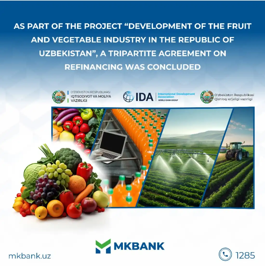 Within the framework of the project "Development of the fruit and vegetable industry in the Republic of Uzbekistan" with the participation of the International Bank for Reconstruction and Development, A three-way re-crediting agreement was signed to attract funds in the amount of 19,7 million USD between JSCB "Microcredit Bank" and the Ministry of Economy and Finance of the Republic of Uzbekistan, the Ministry of Agriculture of the Republic of Uzbekistan.