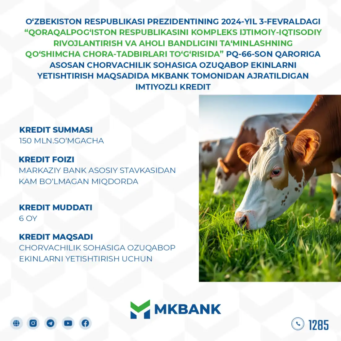 Ўзбекистон Республикаси Президентининг 2024 йил 3 февралдаги «Қорақалпоғистон Республикасини комплекс ижтимоий-иқтисодий ривожлантириш ва аҳоли бандлигини таъминлашнинг қўшимча чора-тадбирлари тўғрисида» ПҚ-66-сон Қарорига асосан чорвачилик соҳасига озуқабоп экинларни етиштириш мақсадида Микрокредитбанк томонидан ҳам имтиёзли кредитлар ажратилмоқда.