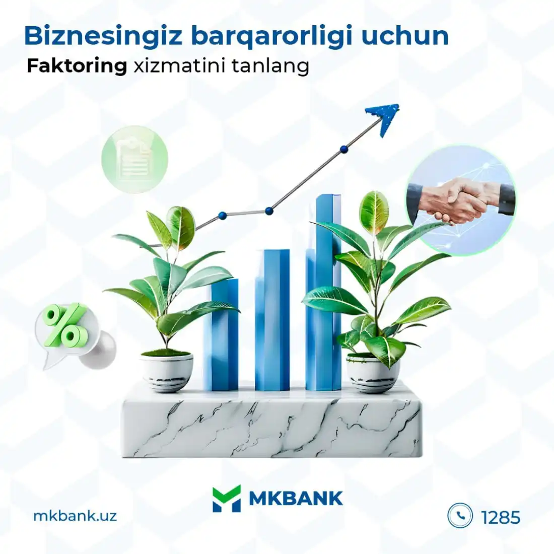 Маълумот ўрнида айтиш лозимки, банк томонидан корпоратив, кичик ва ўрта бизнес вакиллари, ишлаб чиқарувчилар, савдо компанияларига 180 кун муддатгача (олди сотди ёки хизмат кўрсатиш шартномалари тўлов муддатидан келиб чиқиб), 8 фоизгача дисконт шартлари асосида факторинг хизматлари таклиф этиб келинмоқда.