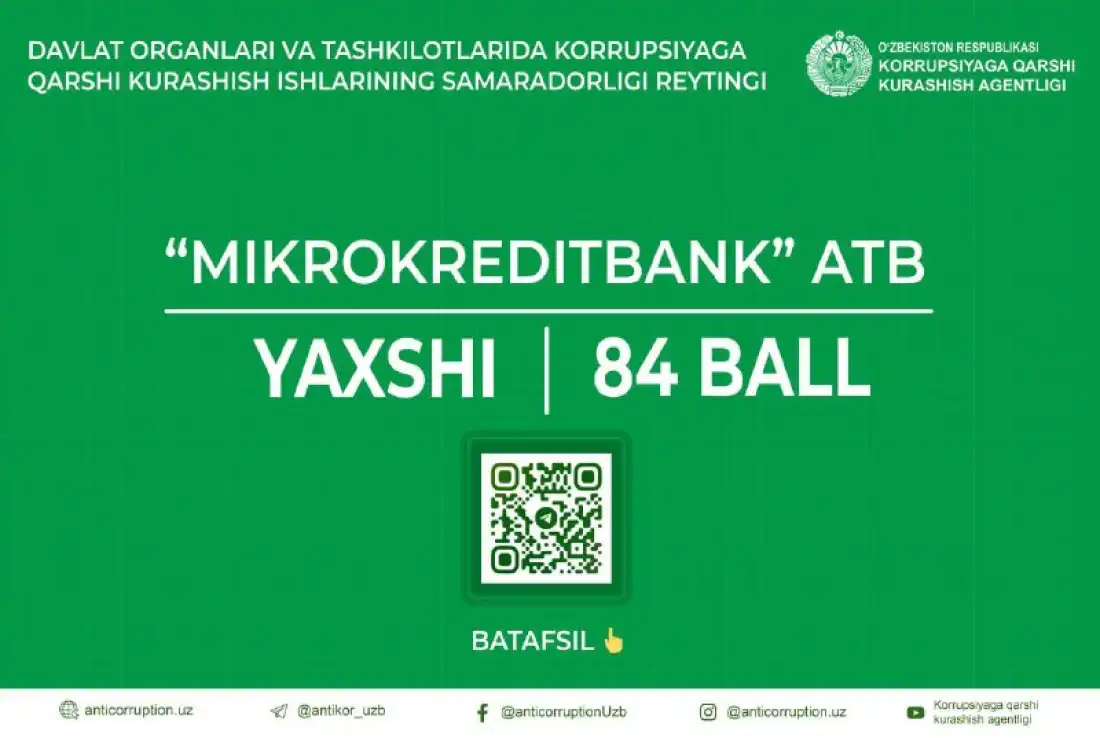 Ўзбекистон Коррупцияга қарши курашиш агентлиги маълумотларига кўра, “Микрокредитбанк” АТБ 95 та давлат ташкилоти орасида коррупцияга қарши рейтингида тижорат банклари орасида яшил рейтингда яхши кўрсаткичга эга бўлди.