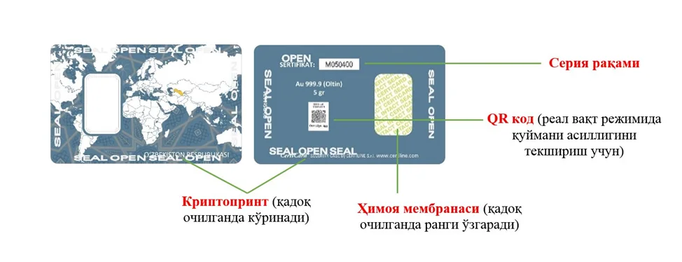 Олтин қуйма ва унинг қадоғи бир ҳил серия рақамига эга. Қадоқда 3 турдаги ҳимоя элементлари мавжуд: