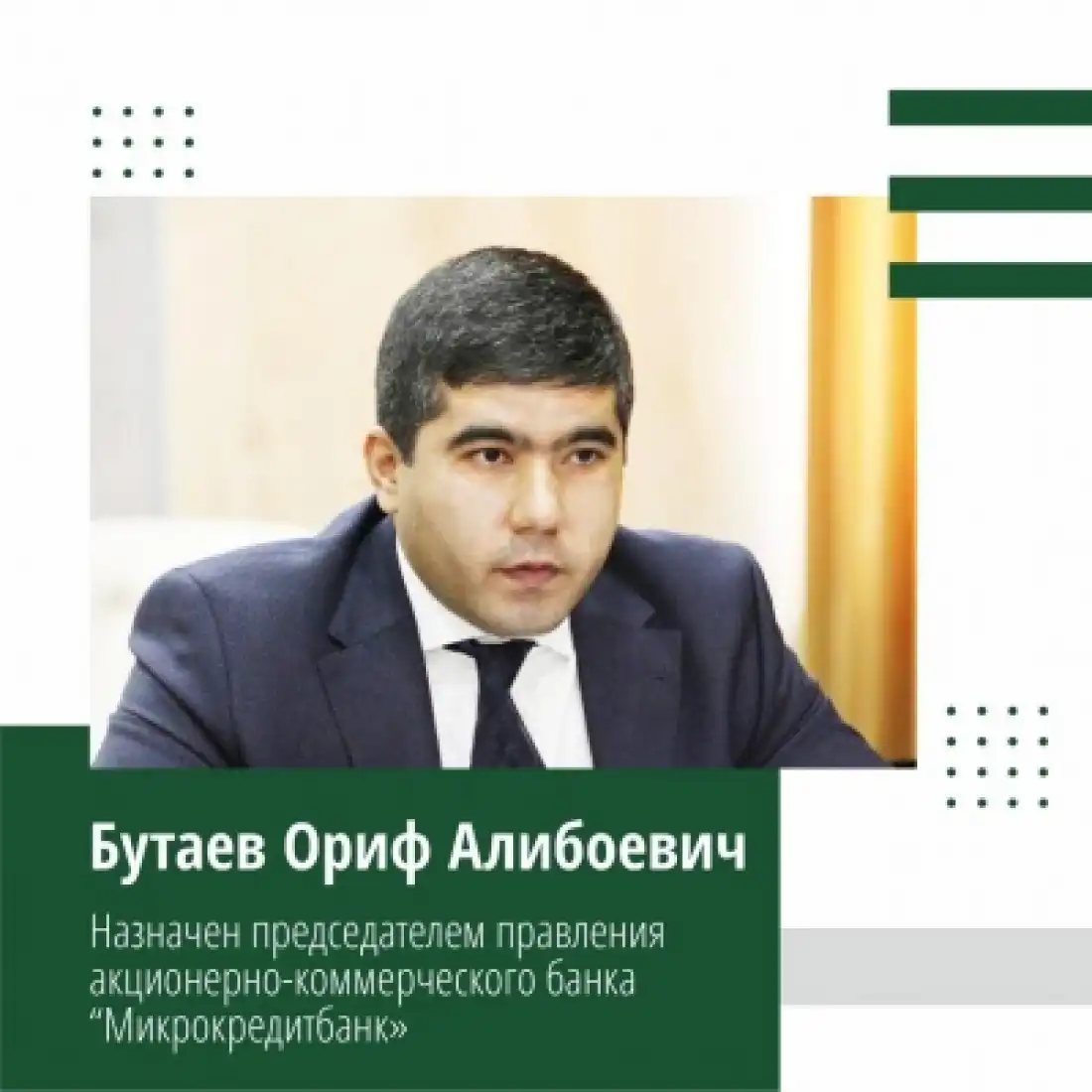 Бутаев Ориф Алибоевич назначен Председателем Правления акционерно-коммерческого банка “Микрокредитбанк". Ориф Алибоевич занимал должность первого заместителя Председателя Правления АКБ “Узпромстройбанк”.