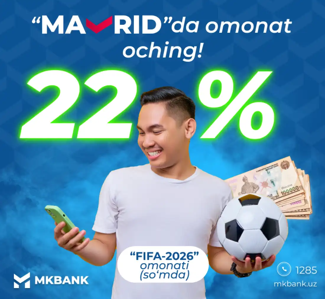 MKBANKning "FIFA-2026" omonatiga mablag'laringizni yillik 21 foizda, Mavrid ilovasi orqali esa yillik 22 foizda joylashingiz mumkin.