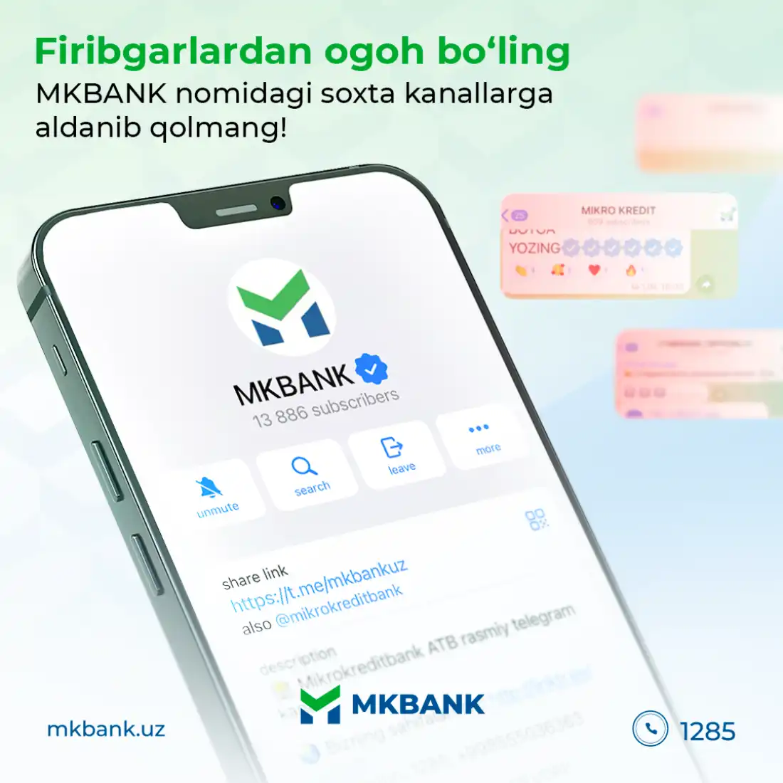 Bugun telegram va boshqa ijtimoiy tarmoqlarda firibgarlar MKBANK nomidan soxta guruhlarni ochib, mijozlarning bank kartasi, SMS kod hamda pasport ma’lumotlari evaziga 50 000 000 so‘mgacha kredit ajratilayotgani haqida bong urmoqda.
