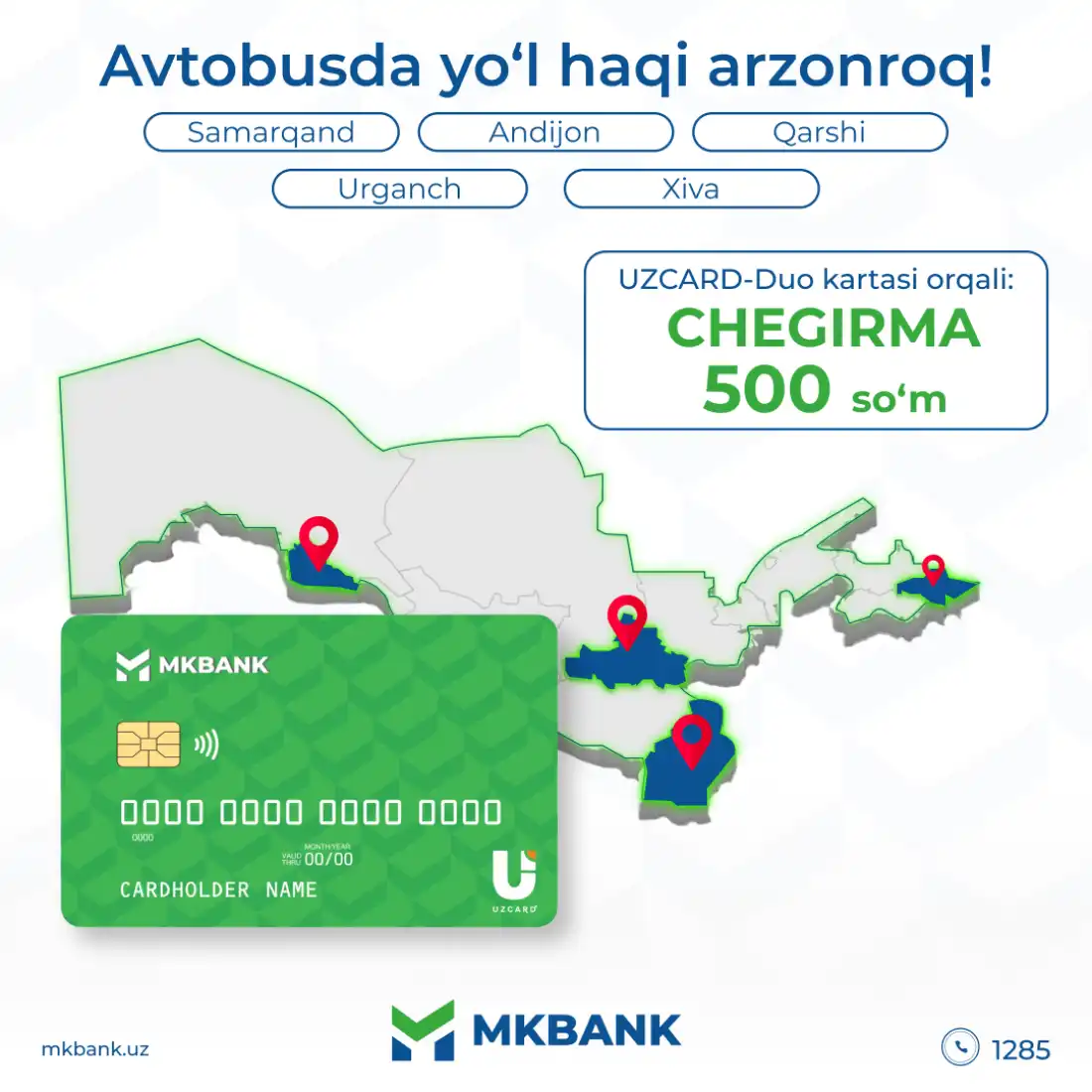 MKBANKning o'zingizga yaqin bank bo'linmalaridan UZCARD-Duo bank kartalarini 1 kun ichida olish imkoniga egasiz.
